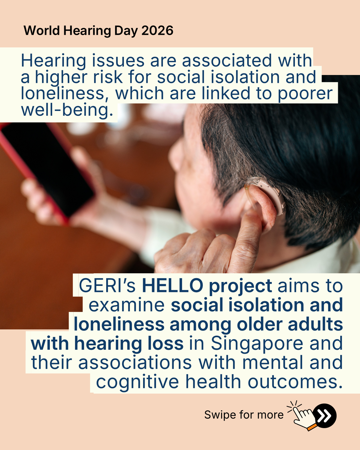 GERI’s HELLO project aims to examine social isolation and loneliness among older adults   with hearing loss in Singapore and their associations with mental and cognitive health outcomes.